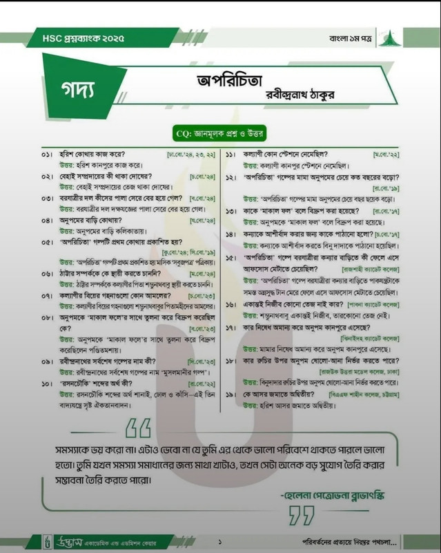এই PDF-এ বিগত বছরের সকল বোর্ড পরীক্ষায় আসা বাংলা ১ম পত্রের গদ্য ও পদ্যের গুরুত্বপূর্ণ জ্ঞানমূলক প্রশ্ন ও উত্তর একনজরে সাজানো হয়েছে। এতে প্রতিটি প্রশ্ন সংক্ষিপ্ত ও সহজ ভাষায় উত্তরসহ দেওয়া আছে, যাতে শিক্ষার্থীরা খুব দ্রুত পড়ে বুঝতে পারে।
